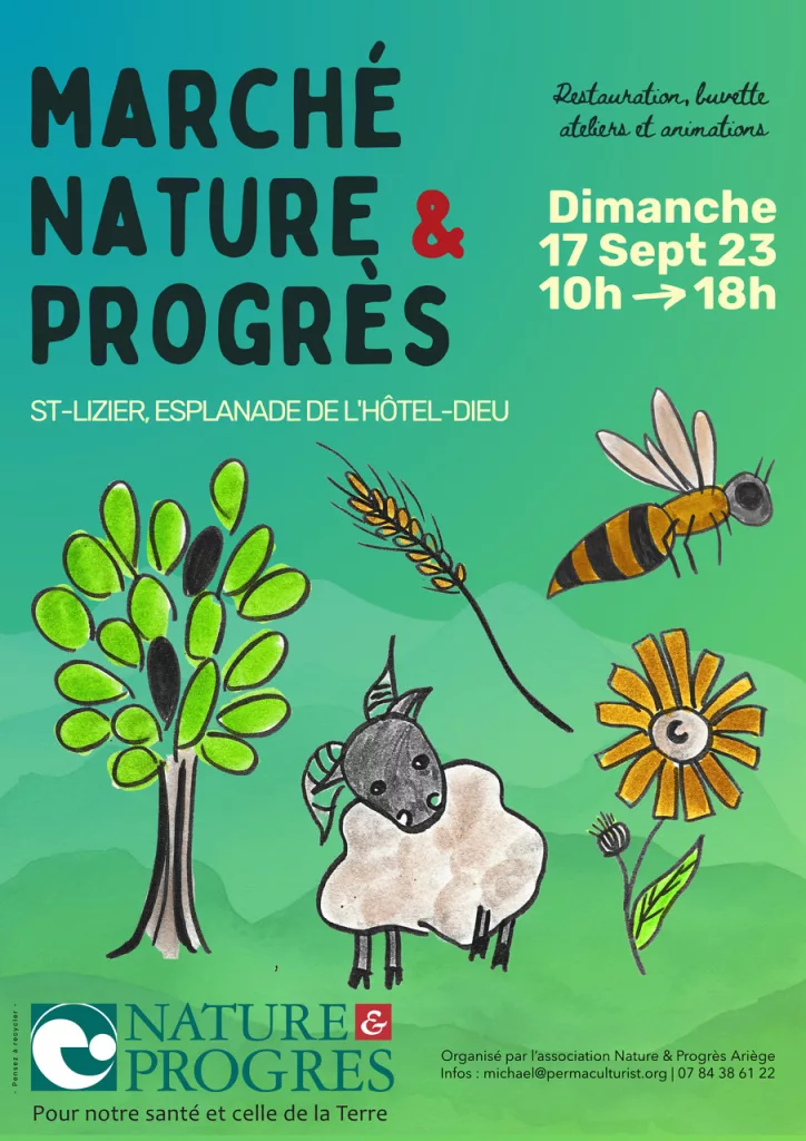 Troisième édition du marché des productrices et producteurs sous mention Nature & Progrès, dimanche 17 septembre 2023, de 10 h à 18 h, sur l’esplanade de l’Hôtel-Dieu à Saint-Lizier (Ariège)